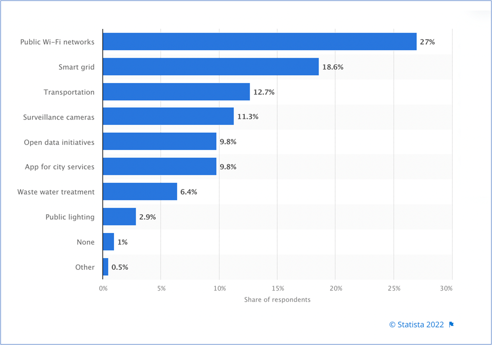 - Risks from complex network interconnectivity: The complex interconnectivity of public and private networks and other information systems can induce troubles. A problem in one service area can spread to others without a proper cybersecurity strategy and framework in place. According to a recent study from Statista, public Wi-Fi networks pose the biggest threat to a smart city ecosystem.