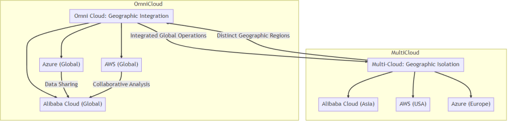 AWS, also operating globally, collaborates with Alibaba Cloud for further analysis and operations. The essence of the Omni Cloud strategy in this context is the seamless flow of data across different geographic regions, breaking the traditional boundaries and enabling a more interconnected and efficient cloud ecosystem.